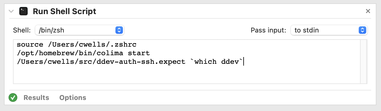 ...be sure to of course replace <youruser> with your Mac username. The reason we should source our .zshrc first is to get all of the paths and other information the script needs. Automator scripts will run with no environment, so sourcing the environment makes sure you have a $PATH and any other things that make it feel like it's "running as you" (for example, it looks for some Lima-specific folders in your home folder, but without running the source first, it doesn't know how to find them).